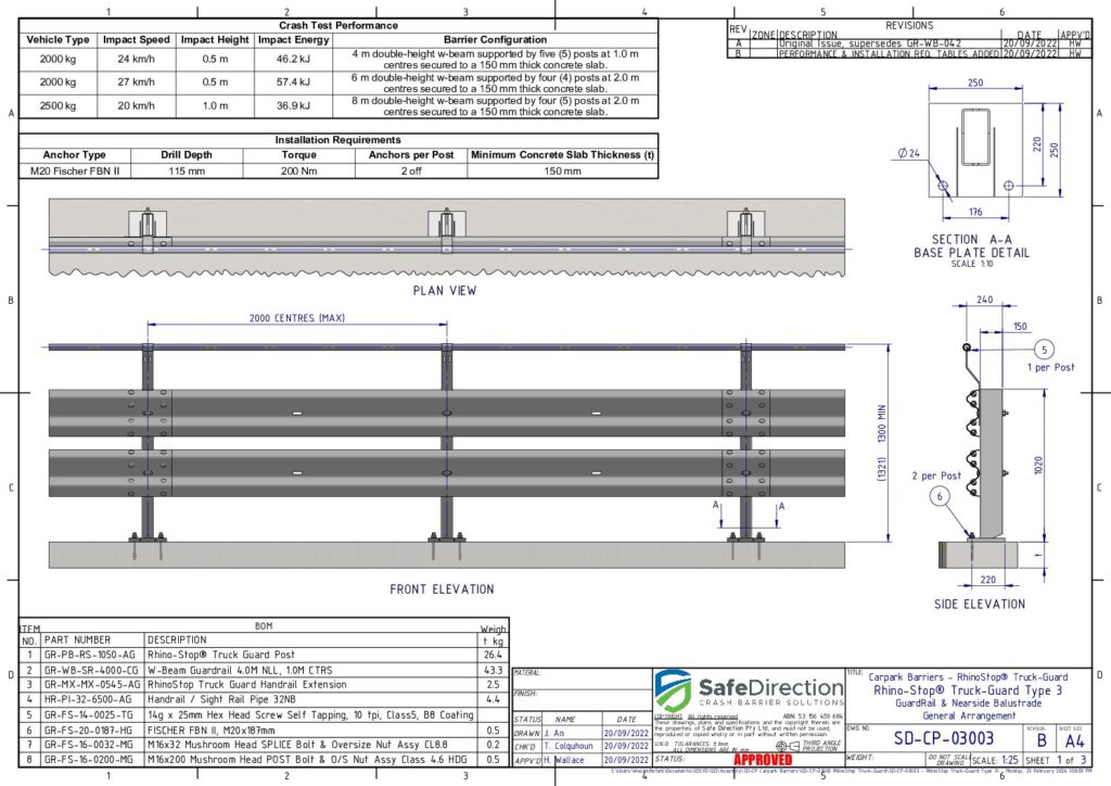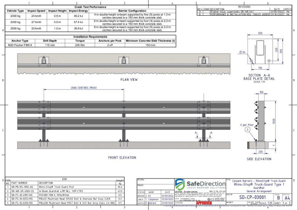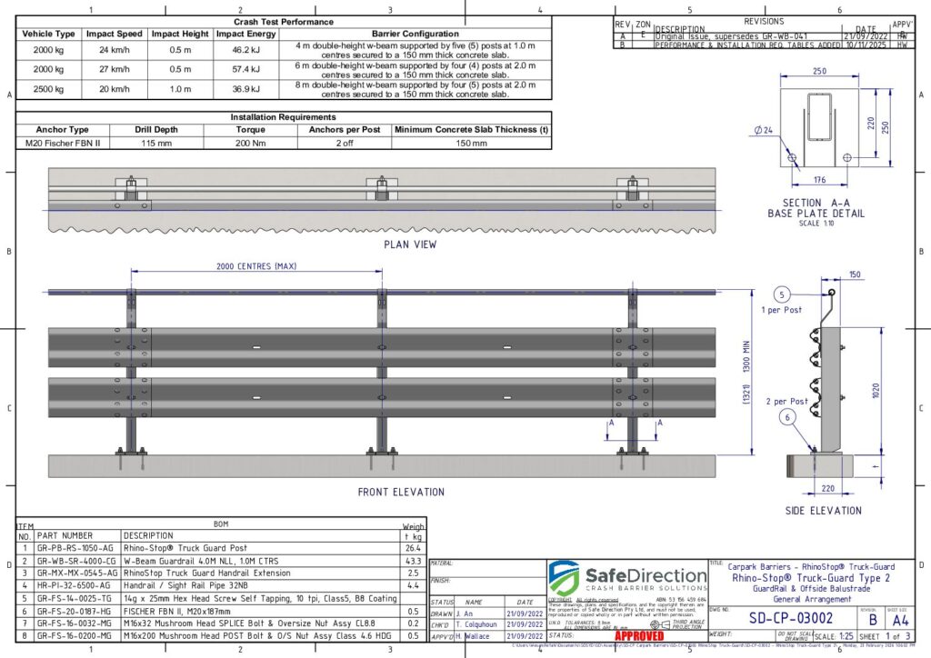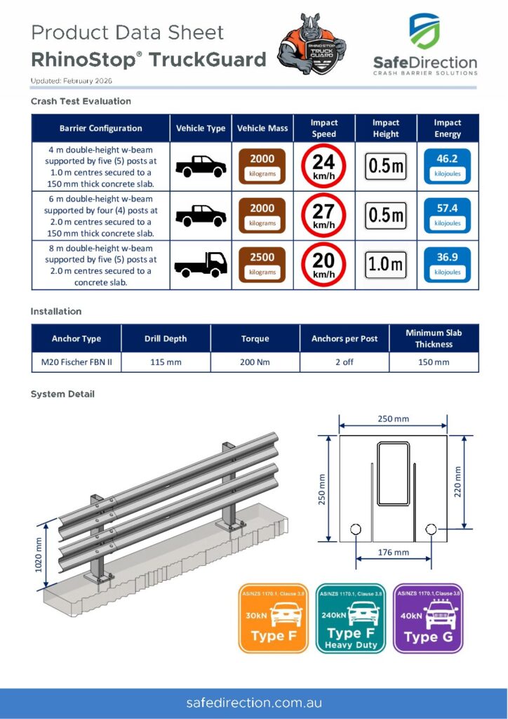 RhinoStop TruckGuard featuring energy-absorbing posts at 2.0 m centres has been crash tested to comply with ALL impact load conditions nominated in AS/NZS 1170.1, Clase 3.8. These crash tests include an impact with a 2000 kg dual cab utility vehicle travelling at 27 km/h and impacting the barrier at a height of 500 mm and a 2500 kg light truck travelling at 20 km/h and impacting the barrier at a height of 1.0 m.