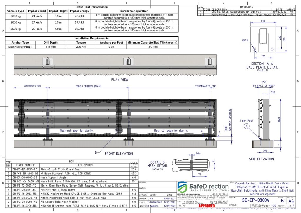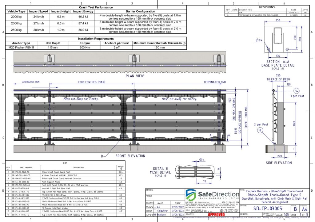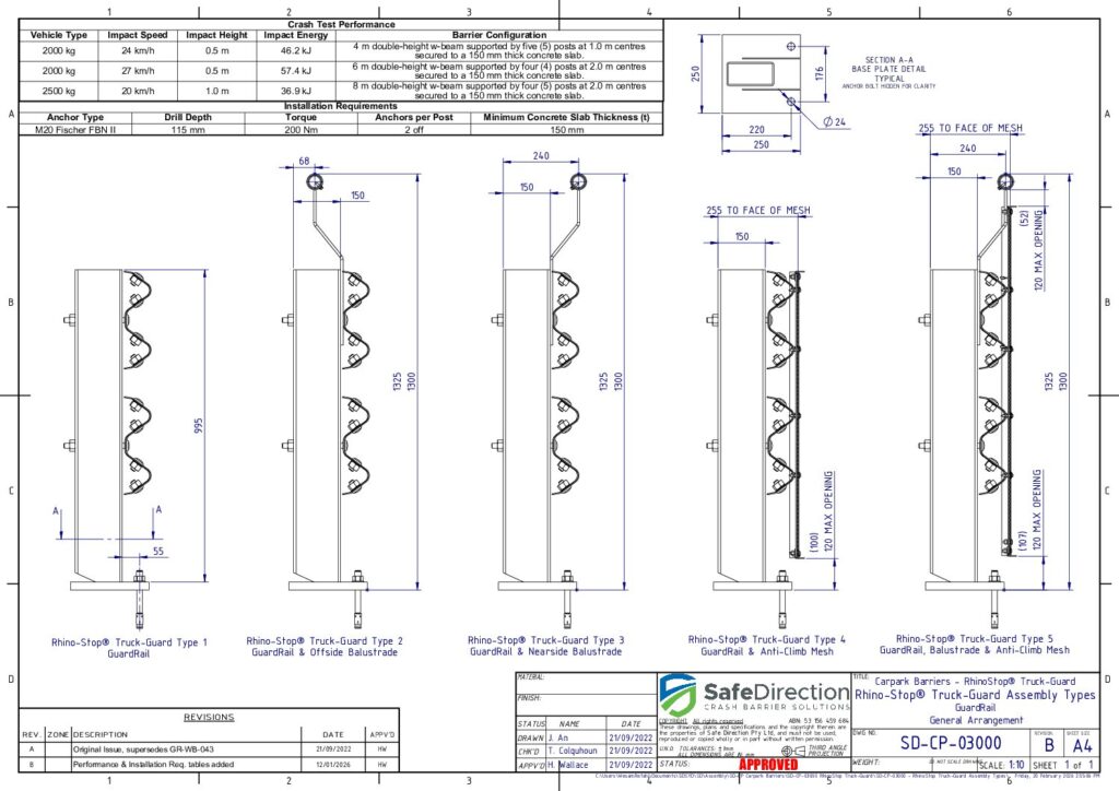 Yes, RhinoStop TruckGuard has been full-scale crash tested when installed on a 150 mm thick elevated concrete slab representing an elevated car park. This crash test configuration is designed to evaluate vehicle impact behaviour and the suitability of the anchor embedment depth.
