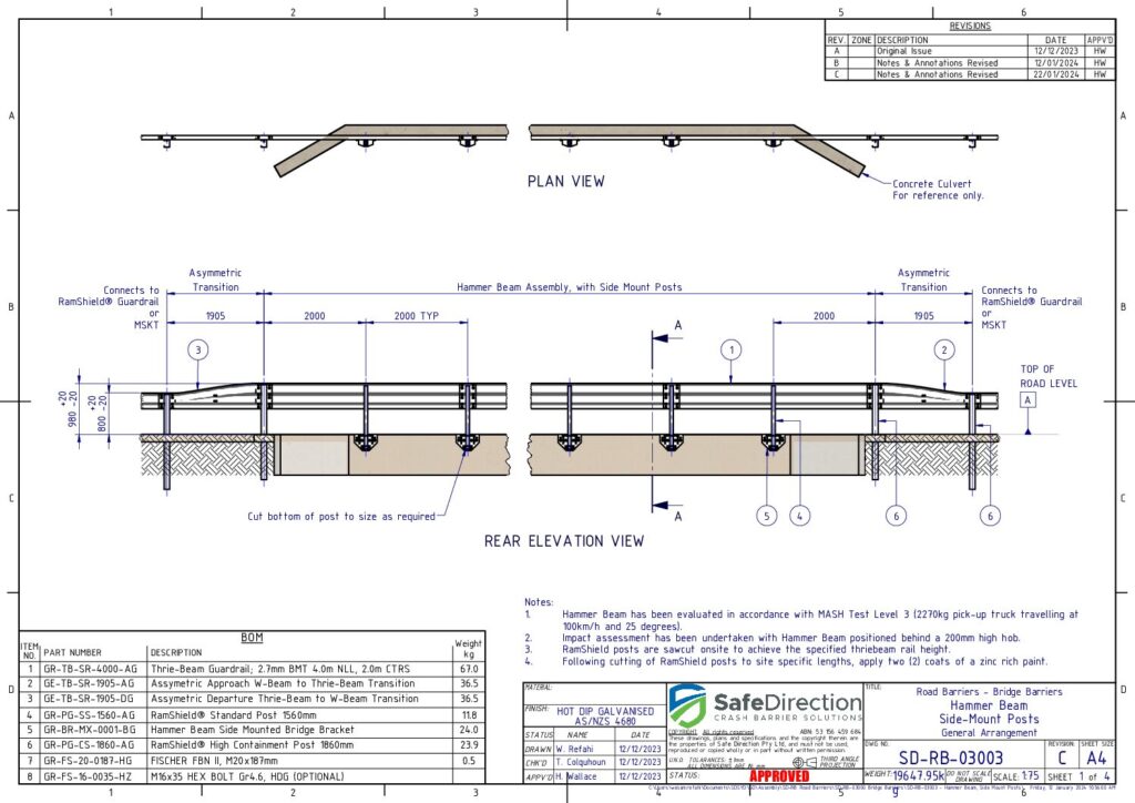 HammerBeam combines the strength of thrie-beam guardrail with the yielding behaviour of the RamShield W-Beam post for longitudinal barrier installations along the edge of elevated structures such as culverts or bridges. The RamShield post is designed to collapse upon impact distinguishing it from heavier, rigid post systems which become problematic when attached to concrete structures. The yielding performance of the RamShield post reduces forces transferred to the elevated structure preventing damage and facilitating ease of repair.