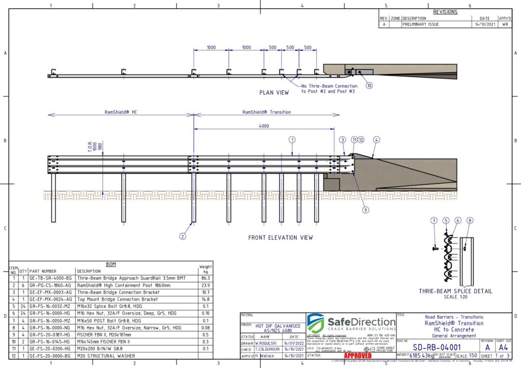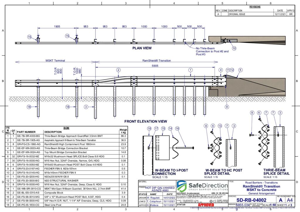 The installation of the RamShield Transition does not require blocking pieces, however, at constrained sites where a kerb or an underground service interferes with the alignment of the posts, a 200mm blocking piece may be installed at each post between the thrie-beam guardrail.
