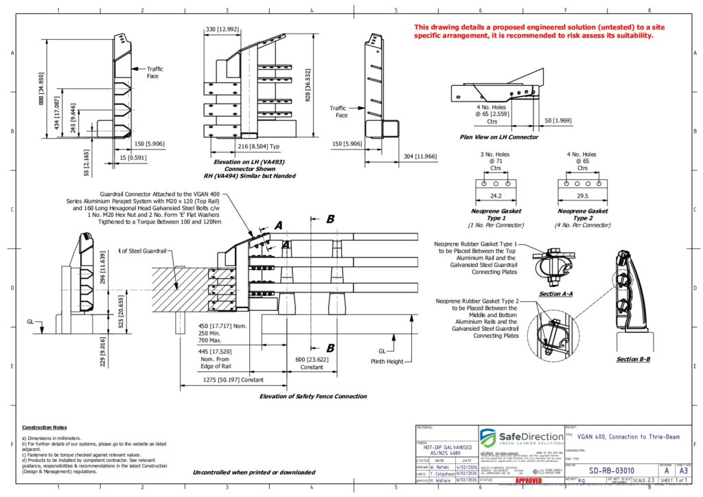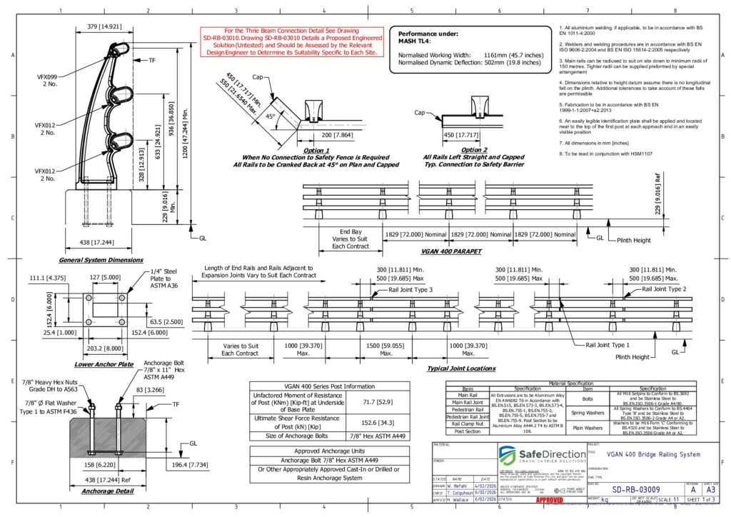 VGAN 400 is a MASH TL4 compliant, modular barrier designed for installation along the edges of bridges and elevated concrete structures. Featuring a triple rail design, VGAN 400 is manufactured from lightweight, special grade aluminium providing safe containment and redirection of high-energy vehicle impacts. The modular design uses standard components facilitating rapid installation and ease of repair. The single-cast posts are secured to cast-in anchors for new bridge constructions or can be secured to existing decks with chemical anchors.