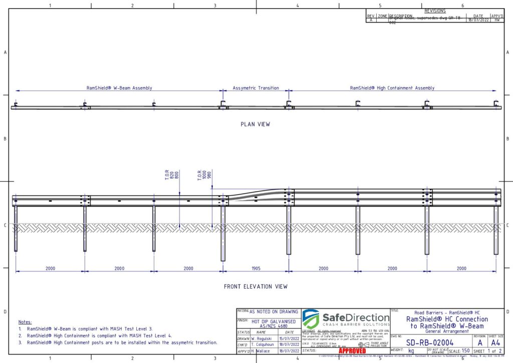 Yes. The use of an asymmetric transition is required to transition from thrie-beam to w-beam guardrail. The asymmetric transition lowers the height to top of the guardrail by 200mm, making it compatible for use with RamShield W-Beam which is installed with a guardrail height of 800 mm above ground level.