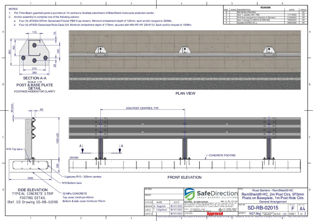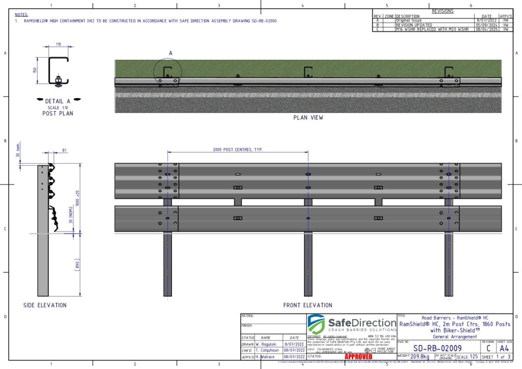 Yes. RamShield High Containment may be installed with BikerShield which is positioned beneath the thrie-beam guardrail and prevents a dismounted motorcyclist from contacting the supporting posts of the guardrail barrier. The BikerShield spring brackets attach directly to the thrie-beam mid-span between posts and absorb the impact energy of the sliding rider. Please refer to the Product Manual and Drawings for design guidance.