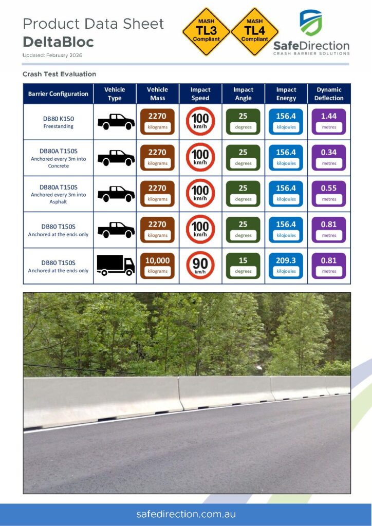 The MASH compliant range of DeltaBloc DB80 precast concrete barriers are widely recognised as the industry’s preferred temporary safety barrier system. The DeltaBloc F-shape systems are designed to safely contain and redirect errant vehicles travelling adjacent to workzones and construction sites. The DeltaBloc designs feature a unique tension bar and coupling system providing lateral support during a vehicle collision. DeltaBloc is available as three (3) options providing designers with a specific solution to meet site deflection and vehicle containment requirements