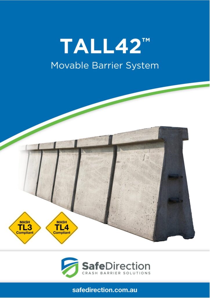 TALL42 is a freestanding, movable concrete barrier system designed to be used with a transfer machine that can reposition the barrier, altering the traffic lane configuration. TALL42 has been specifically designed for contraflow applications for installation on high-volume traffic roadways allowing road owners to increase lane capacity during peak periods. In addition, TALL42 may be deployed on construction projects reducing lane closures during non-work periods.