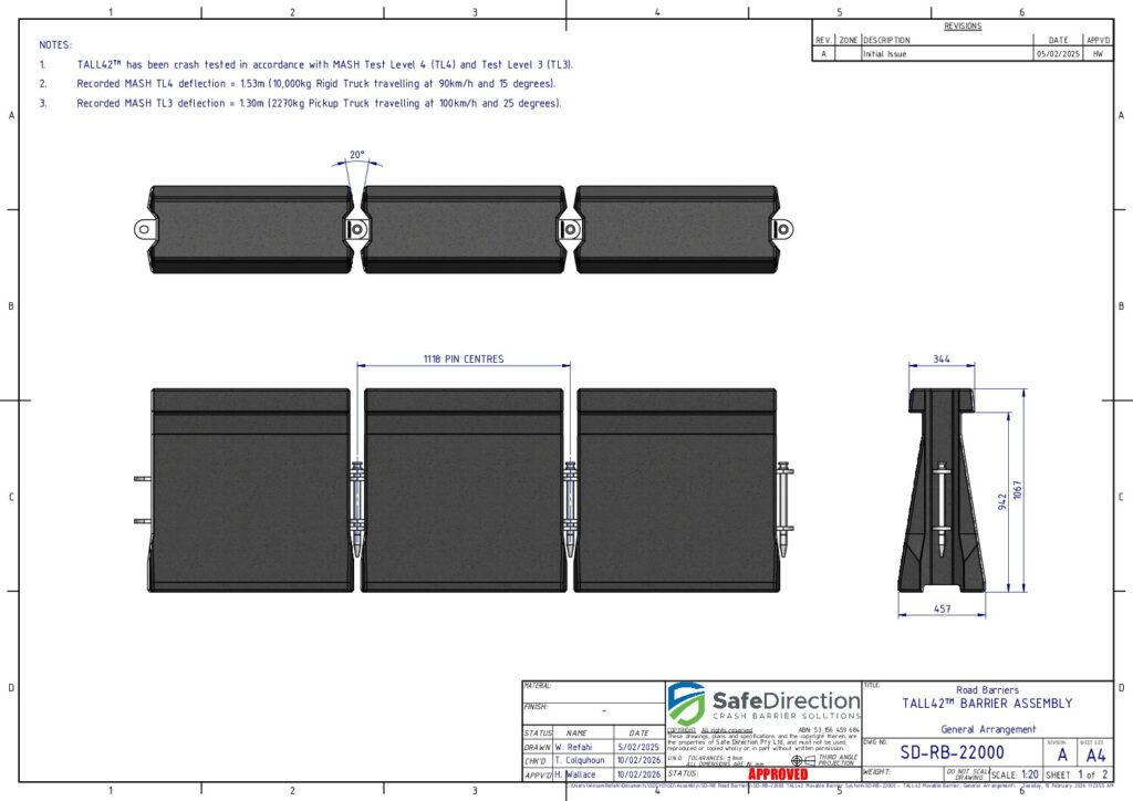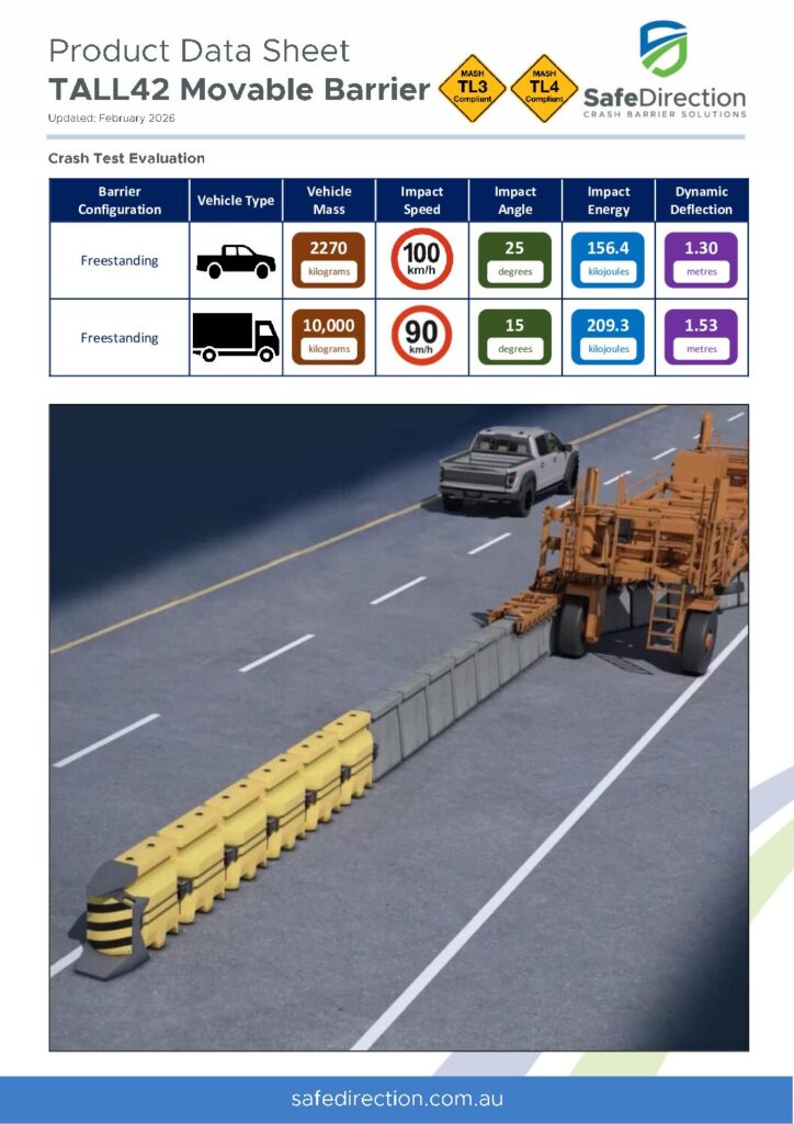 TALL42 is specifically designed to reconfigure traffic lanes, reducing congestion and improving the efficiency of existing road corridors. Unlike contraflows that rely upon bollards or flashing lights, TALL42 provides positive protection, demonstrating safe vehicle containment and redirection in accordance with MASH TL4 and TL3.