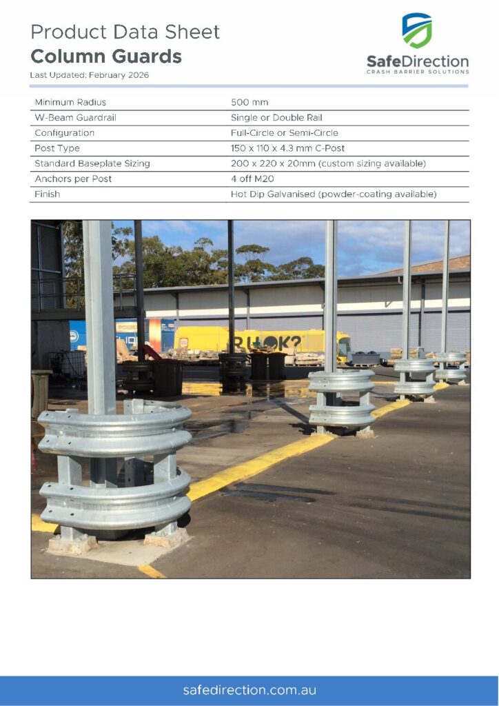 Column Guards are used to shield valuable plant and equipment throughout the warehouse and prevent accidental damage. Featuring w-beam guardrail, column guards may be configured in half-circle or full-circle protection and feature single or double w-beam guardrails. The option of powder coating enhances visibility and alerts the driver of machinery to the nearby hazard.
