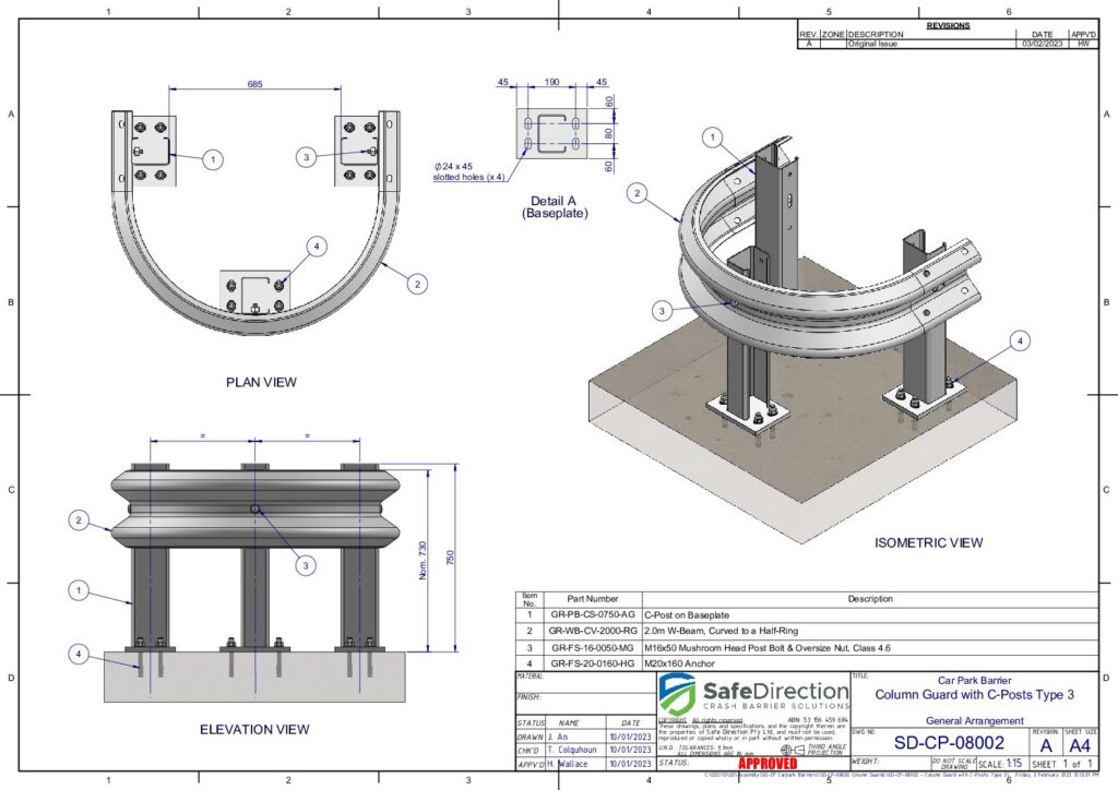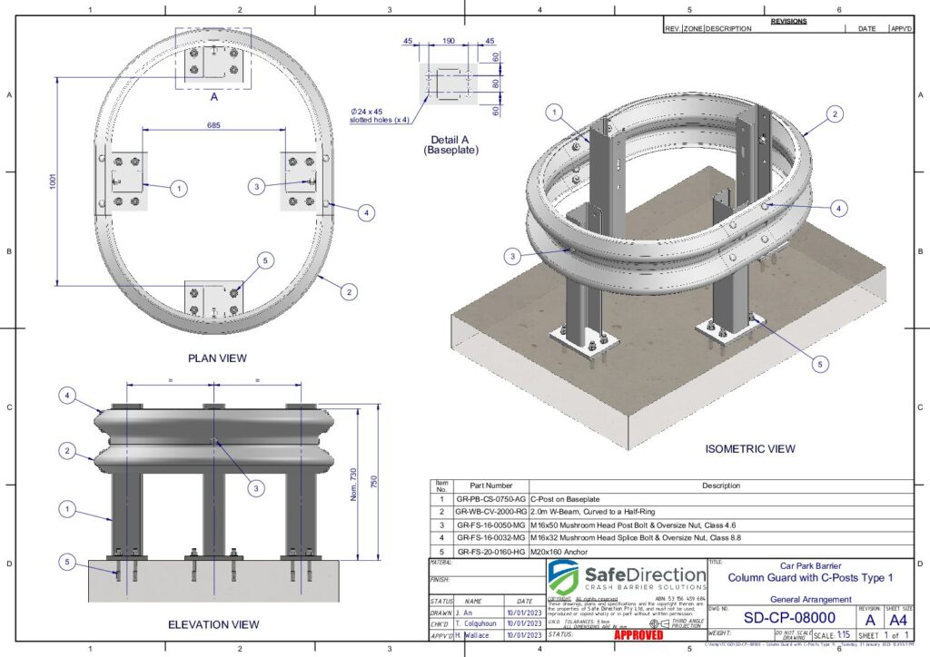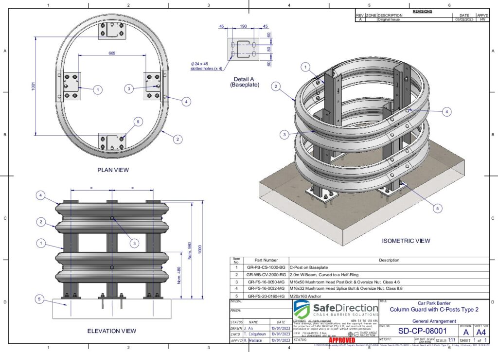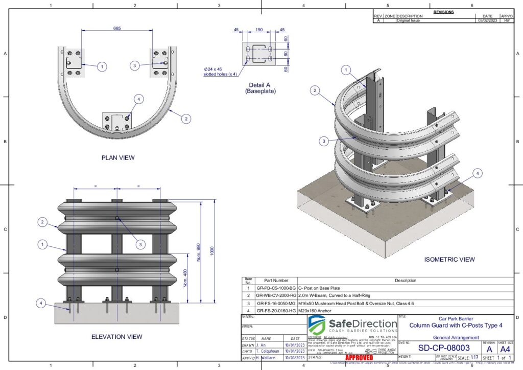 Column Guards feature posts with base plates supporting w-beam guardrail. They are design to protect columns from accidental impacts.