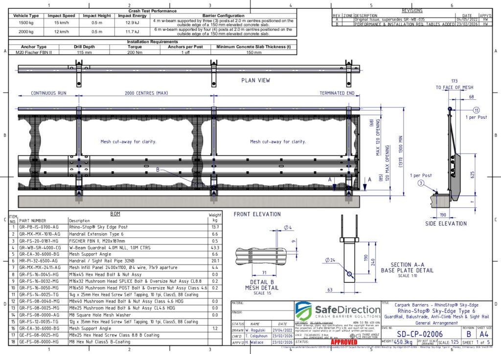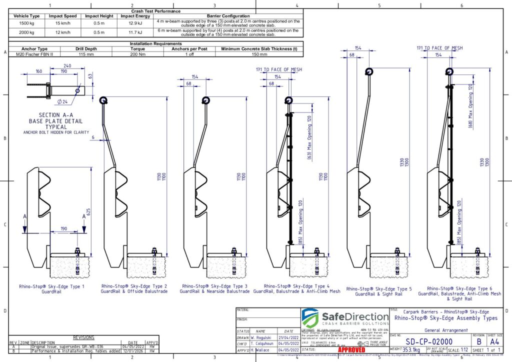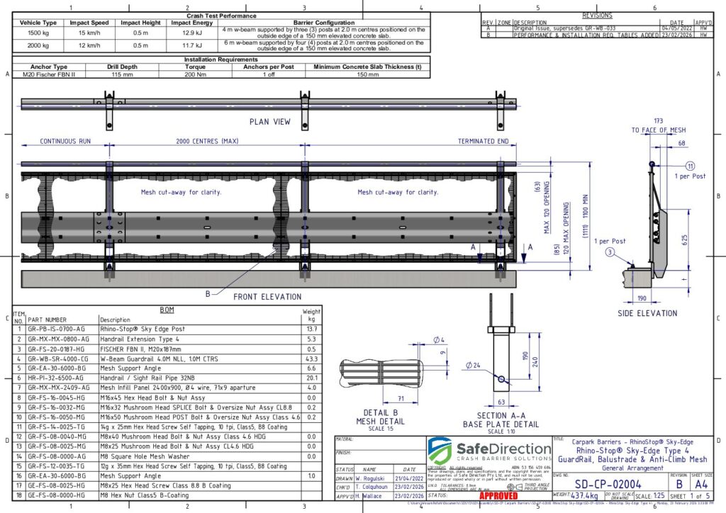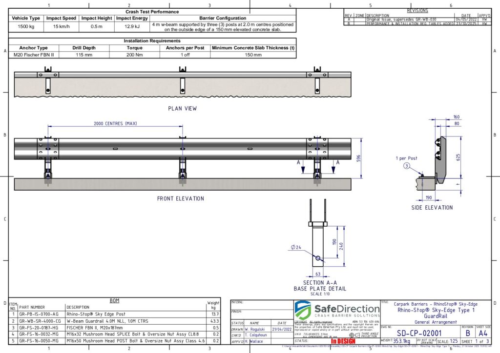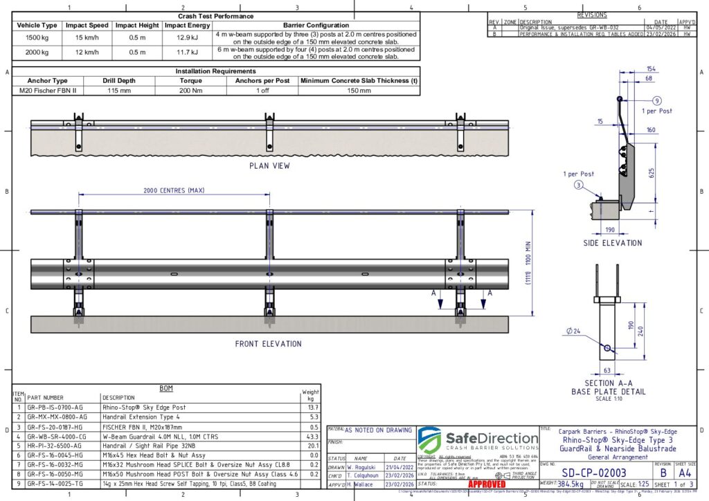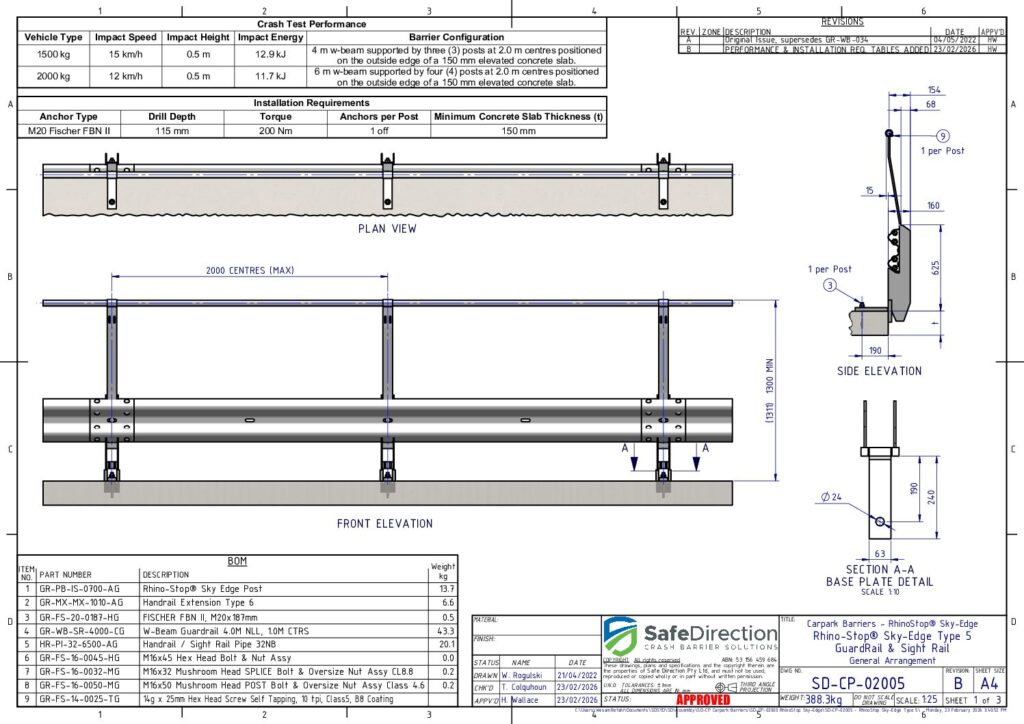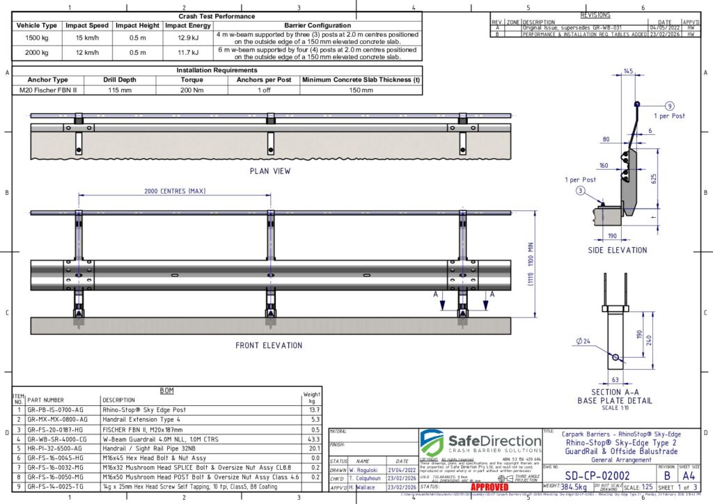 Crash testing is designed to evaluate the behaviour of the barrier and vehicle during a collision. It is important that the crash tested configuration is representative of a real-life installation. Therefore, a barrier promoted to shield a drop to a lower level should be assessed when installed on the edge of an elevated concrete deck. In addition, shorter installation lengths place a higher load on the supporting posts increasing the potential for failure. These considerations are adopted by Safe Direction for the crash test assessment of its RhinoStop product range.